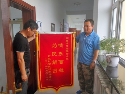 为了感谢邵会库同志一年多来多次入户送温暖、送国家扶贫好政策,7月2日,杨清元儿子杨新民送来一面"情系百姓,为民解困"锦旗,以表达对白云岱林场、对邵会库同志及对党的扶贫政策无尽的感激之情。